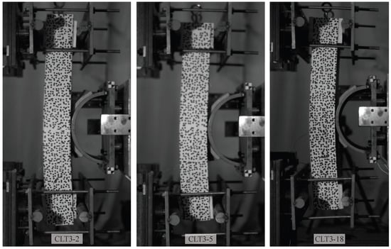 To implement digital image correlation (DIC), each CLT specimen was speckled along its thickness using a randomly generated speckle pattern with a speckle diameter of 0.22 in (5.59 mm). Full-field planar displacement gradients were generated using DIC along the thickness of each specimen. The displacement gradients were post-processed to obtain the strain gradients. Deformation and strain gradients were calculated using NCorr DIC software by Blaber et al. [32].