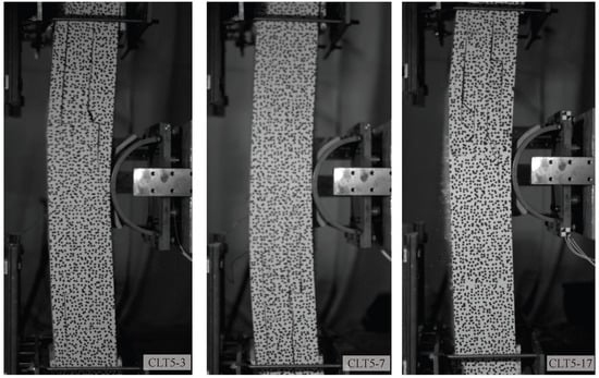 Figure 18 and Figure 19 provide images of CLT specimens loaded at varied impact energies and prior to the development of flexural failure modes. Figure 18 shows specimens CLT3-2 ( kj), CLT3-5 ( kj), and CLT3-18 ( kj) several milliseconds following impact. In each specimen, a combination of rolling shear and longitudinal shear cracks is evident. In panels that exhibited moderate damage to complete failure, flexural failures such as longitudinal cracks and rupture, were noted in the lamellas oriented in the major strength direction. Flexural failures occurred several milliseconds after impact and the development of shear cracks.