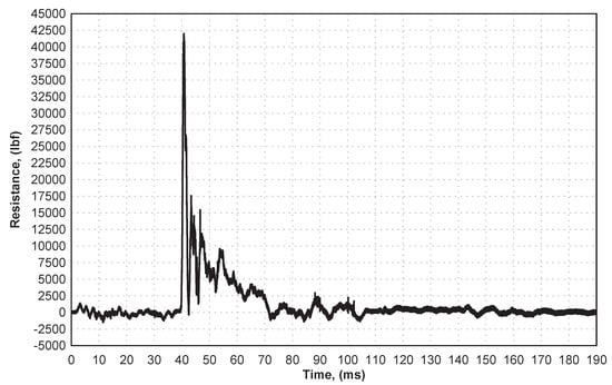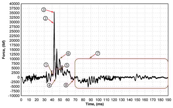 - t = 49.211 ms to 190 ms: Fluctuations in force history are primarily due to deceleration and retraction of the impactor and the resulting wobbling of the aluminum pusher plate toward and away from the direction of impact.