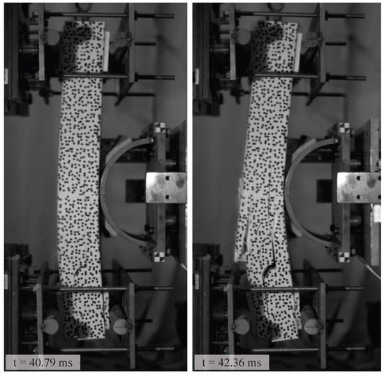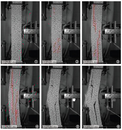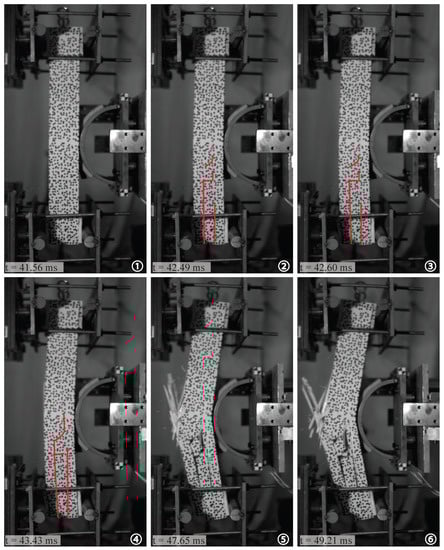 - t = 43.431 ms: RS cracks that previously developed continue to widen. A longitudinal flexural crack develops in the compressive lamina and a lamella in the tensile lamina ruptures. Following this point in time, lamellas in the tensile lamina progressively rupture until the complete failure of the panel.