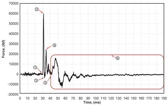 The design of the impactor assembly, which featured dynamic load cells, allowed for the determination of the net impact force history applied to each specimen. The net impact force history provides data on the precise moment of contact between the impactor and specimen and the duration of the impact. The net impact force history made it possible to observe the development of new damage in the specimens based on fluctuations in the forces sensed by the impact load cells. The net impact force history data were paired with a review of the high-speed video footage to characterize failure modes. Figure 22 illustrates the net force history for specimen CLT5-10 with an impact that occurred at 36.72 ft/s (11.19 m/s). Significant fluctuations in the force throughout the history were observed to be correlated with the development of new damage, e.g., a shear crack, or the growth of damage that occurred earlier in the impact event. In Figure 22, several significant fluctuations in force are labeled, and and these fluctuations are discussed below.
