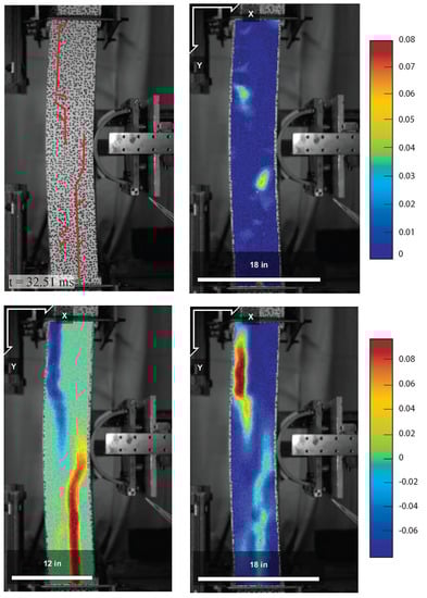 Digital image correlation was implemented to observe the strain gradients present through the thickness of the CLT specimens. Figure 28 shows the , , and strain gradients for a representative specimen, CLT5-10, calculated using DIC. At 32.51 ms, several shear cracks were observed, as well as a massive loss in resistance. Strain concentrations in the DIC plots overlap where shear cracking was observed, and there was no indication of other modes of failure. The strain gradients support the observations that the shear modes of failure were the primary contributors to the loss in resistance of the panel, and that flexural failure modes were largely absent at this time.