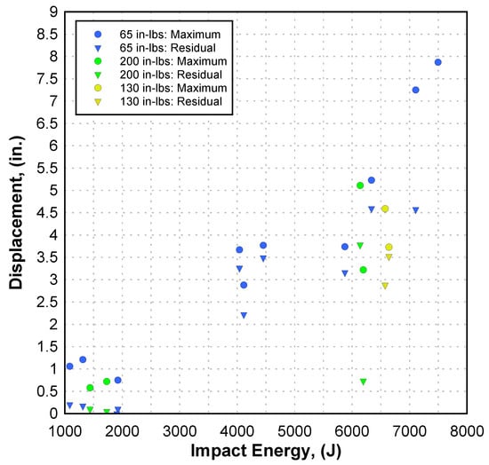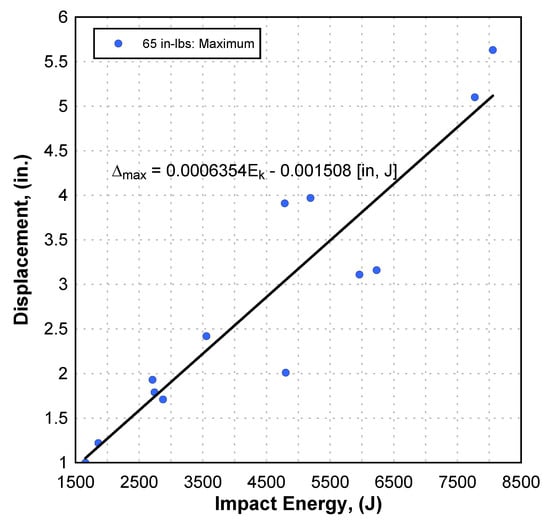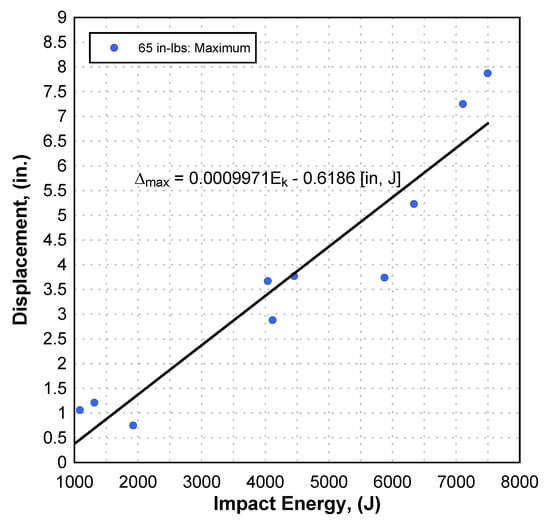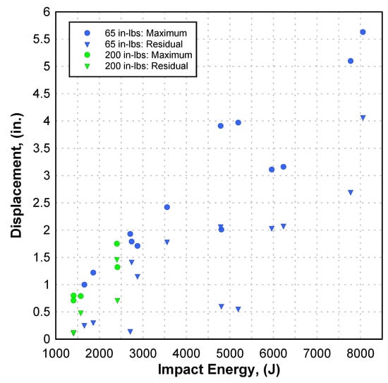 Figure 29 and Figure 30 plot the maximum inbound displacements as a function of impact energy for the three-laminae and five-laminae specimens, respectively.