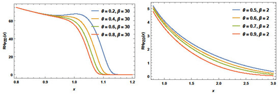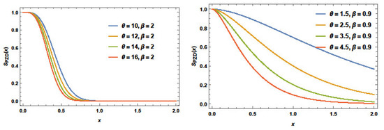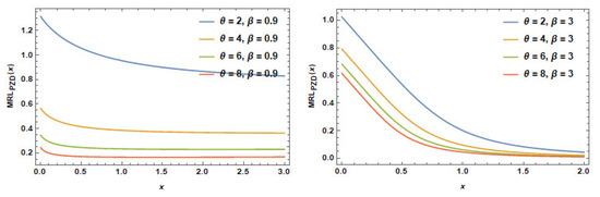 MRL plots of the PZD for some particular parameters are offered in Figure 8. This figure reveals that the MRL for PZD is decreasing for these values with different behavior decreasing–constant and decreasing .