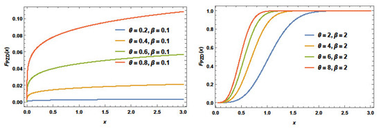 It is clear that for , the PZD reduces to the ZD. Plots of the PZD cdf for some selections of and are presented in Figure 2. It is noted that the cdf shapes of the PZD vary with the distribution parameter values.