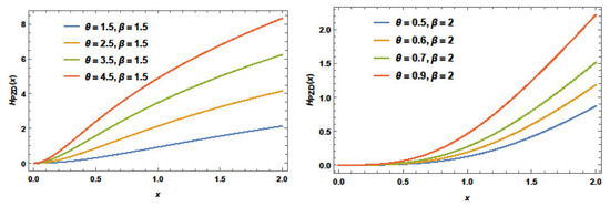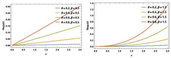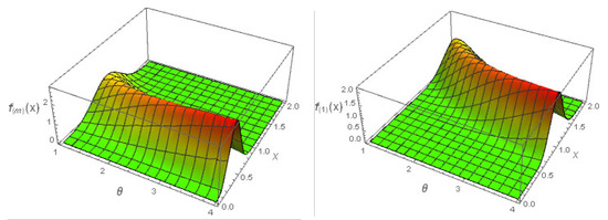 Figure 4 represents the three-dimensional plots of the minimum and maximum pdfs with , and .