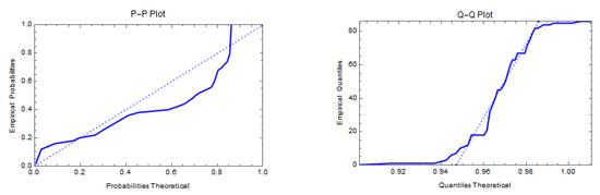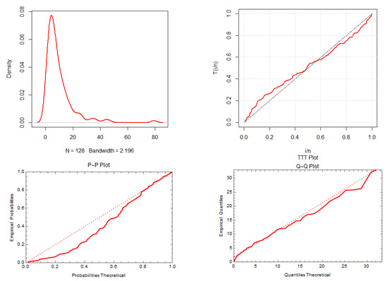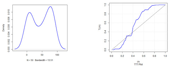 The first real data set refers to the failure times of 50 items put under a life test. It is generally known that this data set displays bathtub behavior of the hazard rate function [43]. This data set has been analyzed by many authors. The data are 0.1, 1.0, 1.0, 1.0, 2.0, 3.0, 82.0, 83.0, 84.0, 6.0, 7.0, 11.0, 36.0, 40.0, 45.0, 12.0, 18.0, 18.0, 21.0, 18.0, 0.2, 1.0, 1.0, 18.0, 18.0, 32.0, 45.0, 47.0, 63.0, 63.0, 67.0, 67.0, 50.0, 55.0, 60.0, 67.0, 67.0, 72.0, 85.0, 85.0, 85.0, 85.0, 75.0, 79.0, 82.0, 84.0, 84.0, 85.0, 86.0, 86.0. Figure 9 displays the density, total time on test transform (TTT), probability–probability (P–P) plot, and quantile–quantile (Q–Q) plot of the PZD for the failure times data.