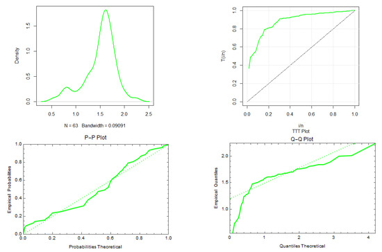 We then considered the data set representing the strengths of 1.5 cm glass fibers. The data set is also analyzed by [45,46]. The data are 0.55, 0.93, 1.25, 1.36, 1.49, 1.52, 1.58, 1.61, 1.64, 1.68, 1.73, 1.81, 2.00, 0.74, 1.04, 1.27, 1.39, 1.49, 1.53, 1.59, 1.61, 1.66, 1.68, 1.76, 1.82, 2.01, 0.77, 1.11, 1.28, 1.42, 1.50, 1.54, 1.60, 1.62, 1.66, 1.69, 1.76, 1.84, 2.24, 0.81, 1.13, 1.29, 1.48, 1.50, 1.55, 1.61, 1.62, 1.66, 1.70, 1.77, 1.84, 0.84, 1.24, 1.30, 1.48, 1.51, 1.55, 1.61, 1.63, 1.67, 1.70, 1.78, 1.89. Figure 11 represents the density, TTT, P–P, and Q–Q plots of the PZD for the glass fiber data.