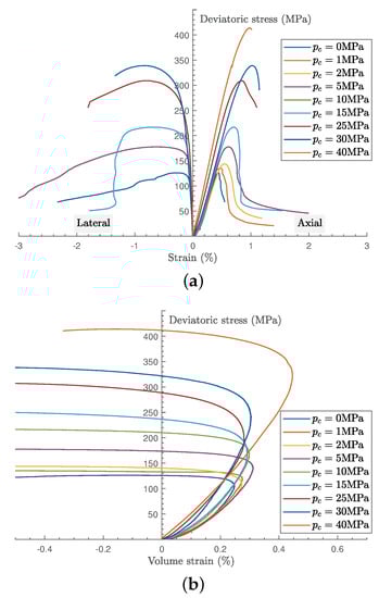 According to the traditional sign convention in geomechanics, the compressive stress is considered here as a positive value. The conventional triaxial compression tests are conducted firstly and the deviatoric stress versus the axial and lateral strains under different confining stresses are shown in Figure 2a. The Young’s modulus can be determined from the linear part of the axial strain and deviatoric stress curve as GPa and the Poisson’s ratio can be calculated from the ratio of lateral strain over the axial strain as . Figure 2b presents the curves of the deviatoric stress versus volumetric strain of Beishan granite under different confining pressures. The transition from compressibility to dilatancy, as well as its dependence on confining pressure are observed on macroscopic scale [37].