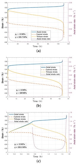The experimental results of single-stage creep tests are shown in Figure 3. A clear trend is observed that creep failure occurs at shorter timeframe when the deviatoric stress is higher. When the deviatoric stress (q) is 225.7 MPa, the creep failure occurs at around 110 h after the deviatoric stress is applied. When the deviatoric stress is increased to 228 MPa, the creep failure occurs at 64 h; as the deviatoric stress increased to 232.5 MPa, the creep failure occurs at around 1.7 h after the deviatoric stress is applied. It is thus concluded that the creep failure time is very sensitive to the levels of the deviatoric stress. When the deviatoric stress is increased by 3%, the creep failure time is reduced by 98%. If we calculate the axial strain rate and use it as the second y axis in the same plot as shown in Figure 3, clear boundaries of three typical creep stages (primary creep stage, steady creep stage, and accelerated creep stage) can be observed in all tested cases with different levels of deviatoric stresses. As summarized in Table 1, in all three tests, the accelerated creep stage has the highest strain rate in both axial () and lateral () directions, whereas the steady creep stage has the lowest strain rate. It is noted that, while the lower deviatoric stress case is one where q is equal to 225.7 MPa, the axial strain rates in all three stages are lower than the axial strain rate in the higher deviatoric stress case where q is equal to 232.5 MPa.