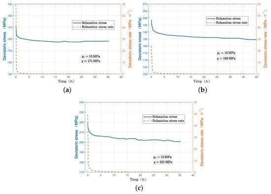The results of the single-stage relaxation tests are shown in Figure 4, where the primary y axis is representing the change of the deviatoric stress and the secondary y axis is representing the change rate of the deviatoric stress. Based on the deviatoric stress changing rate, three relaxation stages, which are rapid relaxation, decelerated relaxation, and steady relaxation, can be observed in all three test cases. It is summarized in Table 2, where q is denoted for initial deviatoric stress, whose value are MPa, MPa and MPa, respectively. represents the initial unchanged axial strain and denotes the relaxation rate of axial stress as shown in in Table 2. Furthermore, is the residual deviatoric stress at time t which have been demonstrated in Table 2 Column 3. In this context, the stress relaxation degree is defined as:
