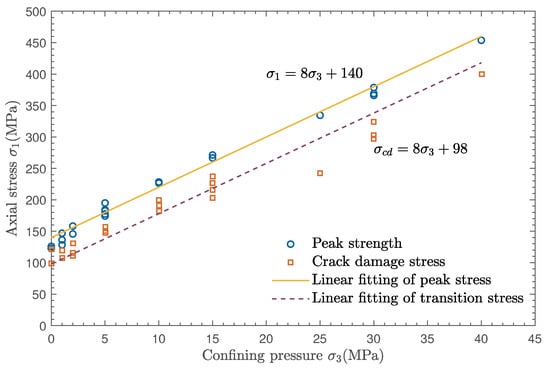 The short-term peak strength, the crack damage stress and its linear fitting functions under different confining pressures are presented in Figure 5.