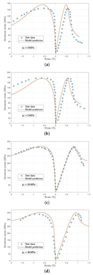 Comparison between test data and analytical simulation of stress–strain curves from conventional triaxial compression tests on Beishan granite under classical confining pressures. (a) MPa; (b) MPa; (c) MPa; (d) MPa.