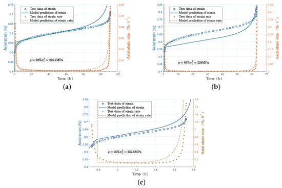 Analytical prediction of creep tests on Beishan granite with different initial deviatoric stress under confining pressure MPa. (a) MPa; (b) MPa; (c) MPa.