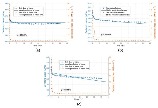Analytical prediction of relaxation tests on Beishan granite with different initial deviatoric stress under confining pressure MPa. (a) MPa; (b) MPa; (c) MPa.