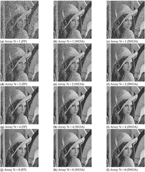 The denoising results of the array SR with fixed parameters, the parameter adaptive array SR based on WOA and our method on Lena image at the array number are N = 1, 2, 4, 8, as shown in Figure 5. It can be seen from Figure 5 that when the array unit is small, there are many noise points on the restored image, resulting in the poor visual effect of the image. With the increase of array units, the image restoration effect is enhanced, and the image is clearer. Furthermore, among the restored Lena images processed by three model methods, the restored image processed by the IWOA-based parameter adaptive array model method proposed in this paper is the closest to the original image, which can better show the gray level and image content of the original image. Through comparing the denoising results of the above three methods, it can be clearly seen that our method proposed in this paper has the best denoising effect, which can better show the gray level and image content of the original image.