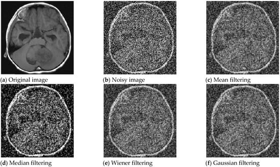 An MRI grayscale image with pixel size of was used for testing. The noise is Gaussian white noise with a mean value of 0 and an intensity of 0.3. Figure 8 shows the MRI grayscale image, the MRI noise image, the denoising MRI image by mean method, median method, Wiener method and Gaussian method. The PSNR performance comparison results of the processed MRI images are shown in Table 5. As can be seen from Table 5, compared with the PSNR of noisy MRI images, the PSNR value of MRI images after mean filtering, median filtering, Wiener filtering and Gaussian filtering is small, the PSNR value improvement effect is not obvious, and the image enhancement effect is not good.