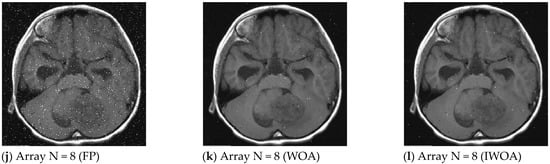 Under different array element sizes, the restored images obtained by the array model method with fixed parameters (FP), the parameter adaptive array model method based on WOA and the parameter adaptive array model method based on IWOA proposed in this paper are shown in Figure 7. It can be seen from Figure 7 that with the increase of array unit size, the noise spots on the denoising image are reduced obviously by the three methods. Among them, under different array unit sizes, the denoising images obtained by our method are the clearest. When the array unit size is 8, the denoising image by our method is very similar to the original image, with only a few noise points.