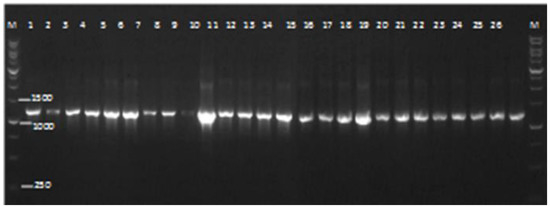 Genetic identification of LAB bacteria isolated from milk or non-dairy raw materials by sequencing the 16S rRNA gene with the use of various universal primers is a popular and reliable technique practiced in recent years [29,31,32]. Exactly 26 LAB isolated from the fermented milk were subjected to L. lactis-specific PCR. A specific 1200 bp DNA amplification fragment was confirmed in all isolates (Figure 1). These PCR-positive L. lactis isolates were further tested by sequencing the 16S rRNA region. The 1089 bp long partial sequence of the 16SrRNA gene of the strains studied showed 99.8% sequence similarity to each other. These sequences displayed the highest similarity to the 16S rRNA gene sequences reported from L. lactis reference strains (99.7%). The phylogenetic analysis placed the A13 and A14 isolates in a cluster together with L. lactis strains (Figure 2), which confirmed that they belonged to the species L. lactis.