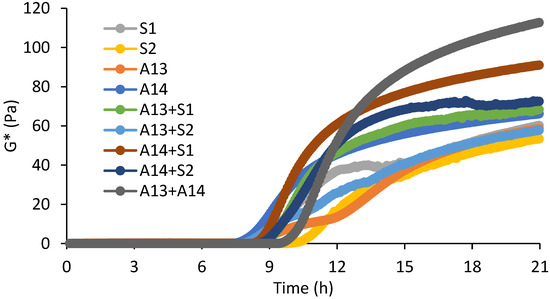 To assess the suitability of the A13 and A14 strains for cheese making, the clotting rate during lactic fermentation was investigated in comparison to two commercial starter cultures, S1 and S2, used in the dairy industry. Dynamic rheometry can monitor the gelation process without destruction of the gel network by measuring properties at low-strain rates [42]. Changes in complex modulus (G*) are shown in Figure 3. Complex modulus shows the viscoelastic behaviour of the sample. The higher the G* values, the stronger the gel [43]. The rheological analysis showed that fermentation with only one strain added to the milk yielded lower complex modulus values, compared to milk fermented with two strains. This is probably an effect of synergistic reactions between the applied strains. It is a very common phenomenon in diary practice. Commercial production of sour cream, yoghurt, kefir, and quark relies on the addition of at least two different strains [7]. At the end of the fermentation process, the wildtype L. lactis A13 and A14 strains were characterized by very similar values of G* to those exhibited by the commercial starters S1 and S2. When the strains were combined, a spectacular increase in the complex modulus value was noted. The results suggest that the wildtype strains can be successfully applied commercially for curd formation.