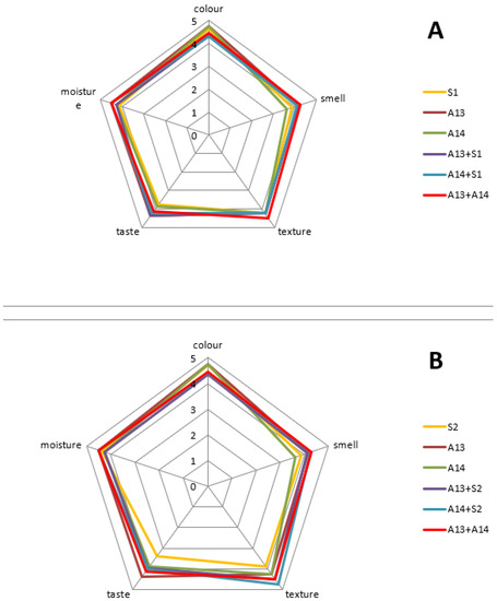 To highlight the suitability of the new L. lactis strains for the production of cheese with correct and/or attractive sensory characteristics, they were compared with cheeses produced by commercial starter cultures, S1 and S2, and by combined strains. The cheeses obtained by various combinations of strains (A13, A14, S1, S2, A13 + S1, A13 + S2, A14 + S1, A14 + S2, A13 + A14) are presented in Figure 4. The maximum sensory scores were awarded to cottage cheeses produced by the mixed L. lactis A13+A14 strains (Figure 5A,B), i.e., 4.44 for the colour, 4.27 for the smell, 4.5 for the texture, 4.125 for the taste, and 4.5 for the moisture, followed by the strain mixtures A13 + S1 and A13 + S2. The weakest sensory results were achieved by cheeses manufactured with use of the S1 culture (3.87 for the smell, 4.25 for the texture, 3.75 for the taste, and 4.13 for the moisture; however, the colour was highly appreciated with a score of 4.65), with the S2 culture (4.71 for the colour, 3.86 for the smell, 3.87 for the texture, 3.37 for the taste, and 4.37 for the moisture), and with the A14 strain (4.74 for the colour, 3.62 for the smell, 4.25 for the texture, 3.87 for the taste, and 4.25 for the moisture). As emphasised by the panellists, the best cheese was made with the use of the newly isolated strains L. lactis A13 and A14; therefore, they can be used for cheese production in the future. In a study conducted by Nomura et al. [15], samples of coagulated milk inoculated with L. lactis isolates were organoleptically evaluated in terms of flavour by assessment of the degree of bitterness, maltiness, and sourness and the results showed a clean, acid flavour in samples inoculated with only 20% of the strains.