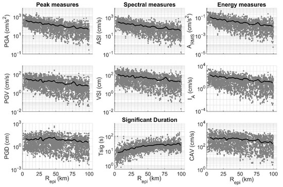 Variation of peak amplitude, spectral, temporal, and energy intensity measures with epicentral distance. Black solid lines represent the moving average. PGA and PGV decrease with epicentral distance, whereby the attenuation of PGA is stronger. PGD follows a constant trend with distance. Spectral intensity measures and energy measures decrease with distance, except for CAV, which remains almost invariant. Significant duration (Tsig) increases with distance.