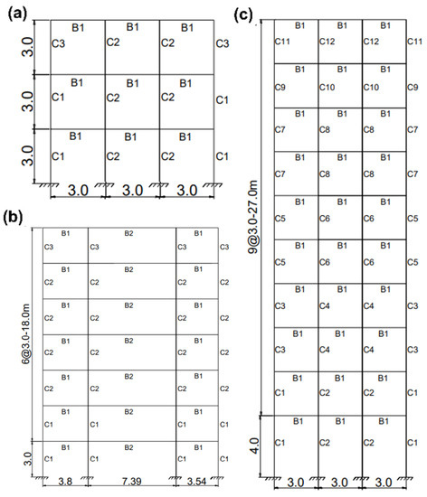 Geometric description of Frames #3, #9 and #14 in Table 2. All dimensions are in meters. (a–c) corresponds to short, intermediate and long period structures.