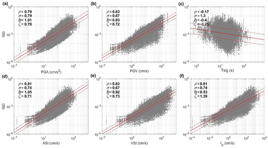 Here, a and b are coefficients obtained through linear regression; δ is the residual variability to characterize the variabilities between observed and predicted EDPs. For Equation (1), a lower dispersion measure indicates a more proficient IM.