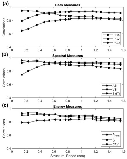 In this section, we investigate the structural period dependence of the estimated correlations by classifying frames by their natural period. Figure 6 illustrates the variation of correlations of peak measures, spectral measures, and energy measures with fundamental period of the structure. We observe that correlations of peak measures show significant variations with fundamental period (Figure 6a). PGA exhibits strong correlations for short-period structures (T < 0.4 s), and PGV shows strong correlations for intermediate-period (0.4 < T < 0.8 s) and long-period structures (0.8 < T < 1.2 s). Although the correlations with PGD reveal an increasing trend with period, PGD does not saturate to a constant value for the structural periods considered. Therefore, we conclude that PGD is not a good IM indicator for building frames for this range of natural periods.