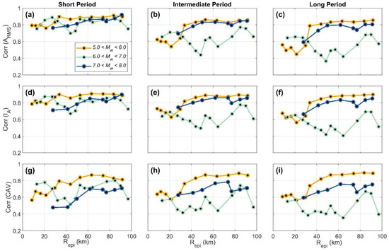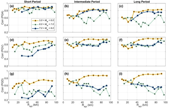 Distance-dependent correlations of peak measures (PGA, PGV, PGD) for different magnitude bins (Mw 5–6, Mw 6–7 and Mw 7–8) (panels a–i). Rows correspond to variations in correlations of PGA, PGV and PGD for three different types of structures—short period, intermediate period and long period (SP, IP and LP). Correlations of PGA and PGV are almost invariant for SP and IP/LP structures, respectively (panels a,e,f). For IP/LP structures, correlations of PGV increase with distance for magnitude bins Mw 6–7 and Mw 7–8. PGD shows significant distance and magnitude dependence for all types of structures.