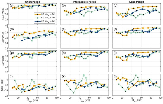 Distance-dependent correlations of spectral measures (ASI, VSI, Sa(T)) for different magnitude classes (Mw 5–6, Mw 6–7 and Mw 7–8) (a–l). Rows correspond to variations in correlations of ASI, VSI and Sa(T) for three different types of structures (SP, IP, LP). Correlations of ASI (a–c) and VSI (d–f) are almost invariant for SP and IP/LP structures, respectively, and do not show any noticeable magnitude dependence. Correlations of Sa(T) vary less for SP structures than IP or LP.