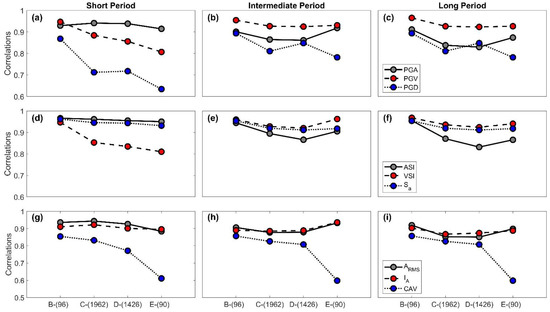Figure 6b depicts the variation of correlations between spectral parameters and ISD with the fundamental period of structures, as well as the correlations between significant durations and Sa(T). Sa(T) seems to be an applicable IM over the entire range of natural period. Since ASI and VSI are influenced by high-frequency and intermediate-frequency contributions of the pseudo-spectral acceleration and velocity response, they exhibit strong correlations at the corresponding natural periods. The good performance of spectral measures over peak measures to predict building response is consistent with previous studies [10,11,12,98]. This can be attributed to the fact that spectral shape of ground motion affects the building response and that peak measures are not representative of the shape of the spectra. Figure 6c shows the period-dependent correlations of energy measures. ARMS and IA exhibit correlations of around 0.9 for short period structures and decrease with period. For CAV, correlations are around 0.8 and remain almost invariant with the natural period.
