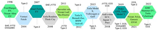 Figure 1 shows the evolution of EVs based on the different manufacturing companies and several charging standards specifications. However, the huge number of EVs on the road require the deployment of more charging infrastructure installed at different locations such as residential areas, offices, parks, or shopping malls [38]. EV charging infrastructure mainly consists of EV supply equipment (EVSE), which comprises numerous charging connectors based on the different manufacturing companies in different countries. Depending on the location, EV charging infrastructure can be categorized into public, private, and semi-public. A detailed description of public, private, and semi-public charging infrastructures is as follows.