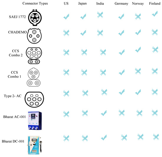 - EVEXPERT. Connector Types for EV Charging around the World. Available online: https://www.evexpert.eu/eshop1/knowledge-center/connector-types-for-ev-charging-around-the-world (accessed on 6 April 2022).