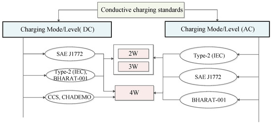 - Bharat AC-001/ Bharat DC-001India attempted to deploy EV charging standards with the help of Bharat chargers, i.e., Bharat AC-001 for low-powered charging vehicles. It can be equipped with 2W, 3W, and 4W EVs embedded with on-board chargers of low voltage. The variable charging power required for Bharat slow chargers ranges from 110 V to 450 V, based on the different charging levels [77]. On the other hand, to enhance the power supply to the EVs for fast charging, Bharat AC-001 can be upgraded to the Bharat DC-001 charging standard. The upgraded Bharat charging standard is built based on the IEC61851 that can transfer a maximum power of 72 V to the EVs. Moreover, the power supply for charging level 2 and charging level 3 can vary between 30 V and 48 V. To provide fast EV charging, Sharma et al. [78] investigated the conversion of the Bharat AC-001 to Bharat DC-001 charging standard considering the delta Vienna rectifier and a unidirectional DC/DC converter. Therefore, the aforementioned charging standards with variable charging power can be utilized for community charging based on the requirement and travelling destination of the users. Table 3 presents a comparative analysis of various EV conductive charging standards based on parameters such as charging level, charging time, voltage, and type of vehicle.