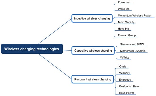 This section presents the classification of wireless charging systems based on the considered wireless charging technologies, such as inductive wireless charging, capacitive wireless charging, and resonant wireless charging. Figure 7 depicts the taxonomy of wireless charging based on the technologies, which is further classified based on the manufacturers as shown in Figure 8. The wireless charging technologies are as follows: