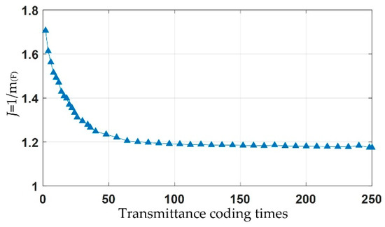 The measurement matrix in Equation (5) is particularly similar to the partial Fourier matrix in the typical compressed sensing measurement matrix. Each element of is , where is determined by the optical path difference induced by the LiNbO3 electro-optic crystal. This parameter can be randomly selected after the transmittance calibration experiment is carried out. From the calibration results, the most uncorrelated transmittance under M external electric field voltages is selected, and M highly uncorrelated compressed sensing measurements can be realized.