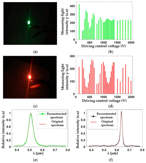 Figure 6d, the relative error does not exceed 3.69% when the measurements number reaches 35. The spectral measurements and reconstruction results of green LED and red LED light sources were recorded concurrently for M = 35 measurements, as shown in
