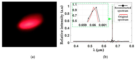 The spectral measurement reconstruction results of LED light sources reveal that the compressed spectral measurement results obtained using our method are in good agreement with the measurement results of the commercial spectrometer HR4000. The reconstruction relative errors of blue, green, and red LED according to Equation (8) are recorded in