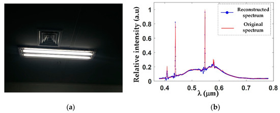 Figure 8, the relative error of laser spectral reconstruction is 7.20%. The full width at half maximum (FWHM) of the laser spectrum measured by the compressed sensing spectrum measurement system is 1.2 nm, which is slightly less than 0.8 nm of HR4000 measurements. This similarity further demonstrates that the FWHM of the spectrum measurement system designed in this paper is small. The system has a high spectral resolution, and the theoretical spectral resolution can reach approximately 0.4 nm for a wide spectral range (0.38–0.78 μm) with 1024 spectral channels. Further, the spectrum of the lighting fluorescent lamp in the laboratory was measured. The experimental results are shown in the