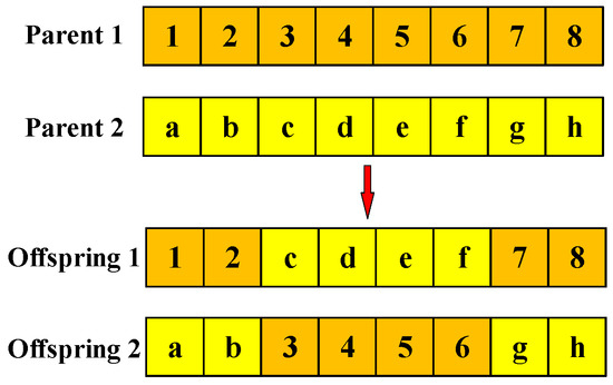Based on this, a dynamic selection crossover operator combining the two-point crossover and the SBX is proposed. Initially, the two-point crossover operator is selected with a higher probability, and a larger search area is proposed to be obtained, while as the iterations proceed, the probability of selecting the SBX operator gradually becomes higher in order to better retain the good individuals. A schematic of the two-point crossover is shown in Figure 1.