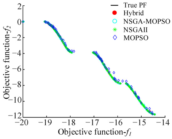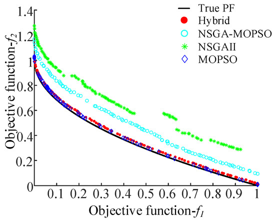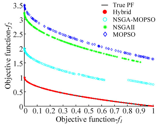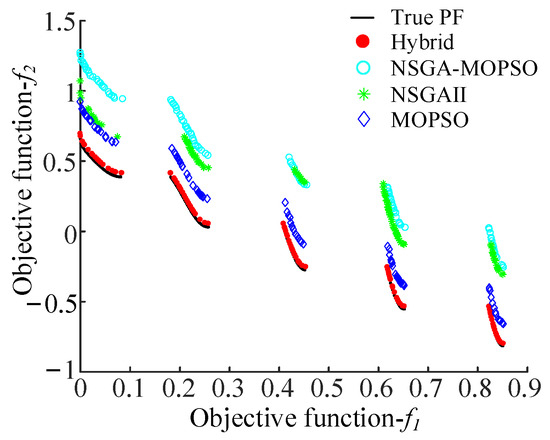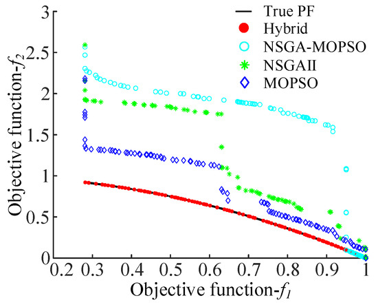 The comparison results of PFs obtained by the aforementioned four algorithms for each test function are presented in Figure 2, Figure 3, Figure 4, Figure 5, Figure 6 and Figure 7, respectively. It can be observed that the Pareto solutions obtained by the proposed hybrid algorithm are much closer to the true PFs as compared to those of its three counterparts, especially for ZDT4, which has a large number of local optima, and ZDT6, which has a non-uniformly distributed PF.