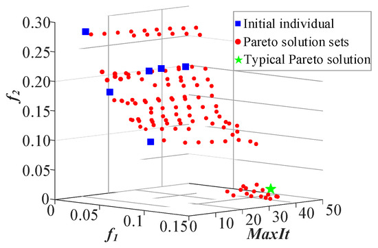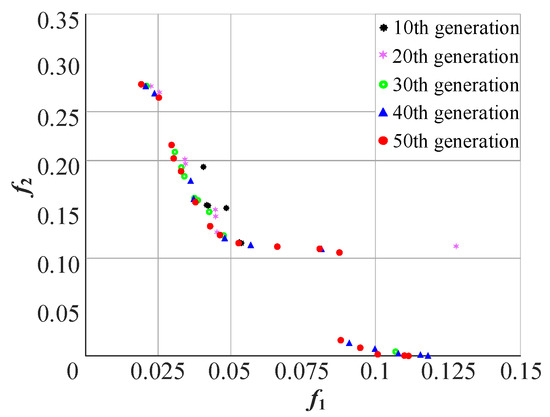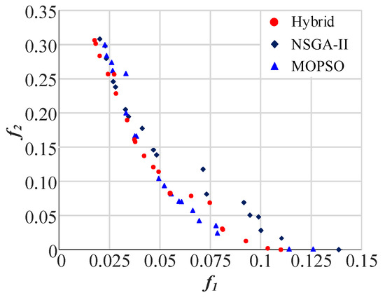The proposed hybrid algorithm is applied to solve this case study, and then compared with its two counterparts, NSGA-II and MOPSO. The comparison results of the Pareto solutions for the three algorithms with the same number of iterations are shown in Figure 9. The NDR metrics for Hybrid, NSGA-II, and MOPSO are 57.72%, 13.79%, and 34.48%, respectively, which indicates that the proposed hybrid algorithm obtains better Pareto solutions. The trajectory of the Pareto solutions obtained by the proposed hybrid algorithm are shown in Figure 10 and Figure 11. The pentagram in Figure 10 denotes the solution with min (f1 + f2). It can be observed that the objective values of f1 and f2 are becoming smaller as the number of iterations increases, which demonstrates that the Pareto solution sets are becoming closer to the true PF.