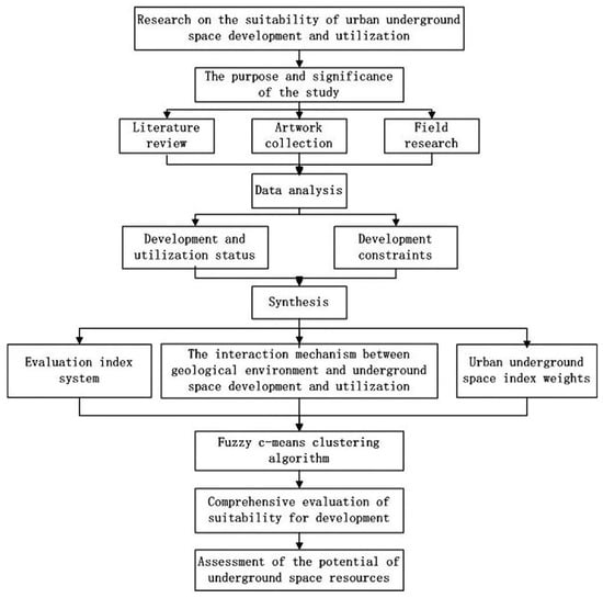 In the process of evaluating the suitability of the geological environment for the development and use of underground space resources in Weihai City, we first carried out the analysis of the influence and control factors for the development and use of underground space resources, established the evaluation index system, and used the AHP method and the fuzzy C-mean clustering algorithm to finally obtain the evaluation results and distribution characteristics of the suitability of the geological environment for the development and use of underground space resources in Weihai City. The overall technical route of the evaluation is shown in Figure 2.