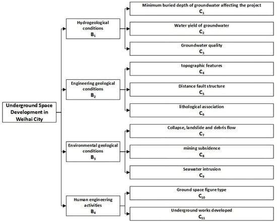 In this paper, 11 factors, including minimum depth of groundwater, groundwater richness, groundwater quality, topography and geomorphology, distance from fracture structure, lithological combination, avalanche, and slip flow, mining collapse, seawater intrusion, ground space feature type, and developed underground engineering, are selected as influencing factors. The index system for evaluating the suitability of underground space resource development in Weihai City is shown in Figure 3.