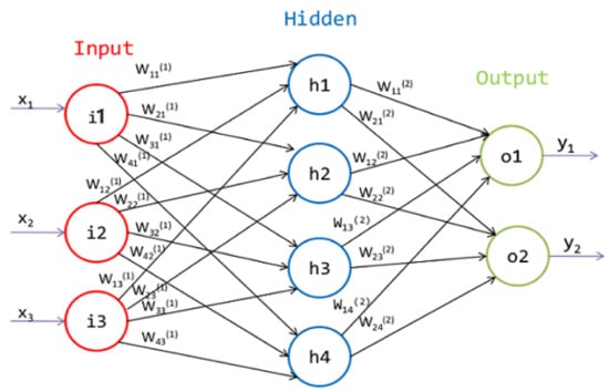 As shown in Figure 1, the artificial neural network mainly consists of input layer (Input), output layer (Output), and hidden layer (Hidden). The i1, i2, and i3 in Figure 1 are the input layers, which are neurons receiving a large number of nonlinear input vectors (x1, x2, x3); the output layers o1 and o2 are the receiving units of the last layer to which the information flows after being transmitted, analyzed, and weighed in the link of the antecedent neurons, and are responsible for outputting the final result; the hidden layers are the neurons between the input and output layers with many neurons (h1, h2, h3, and h4) with weights wij constitute the various layers, which are the features of the input data abstracted to another dimensional space, thus better dividing the features linearly; if more than one hidden layer exists, it means there is more than one activation function whose ultimate purpose is to better linearly divide different types of data [13].