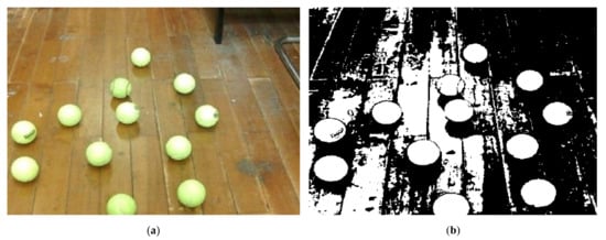 HSV color space-based recognition of tennis balls. (a) Original image; (b) recognition effect picture.