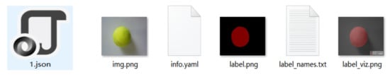 In this paper, we use the labeling tool, labelme, to label the tennis balls in the collected sample images by carefully depicting the outline of the tennis balls in the images to distinguish them from the background of the images, save the labeling results to generate json type files, and transform these json type files to generate the description files for training. The saved json file and the converted description file are shown in Figure 10.