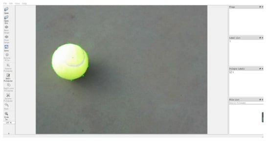 - First, some highly defined and distinctive tennis image samples are labeled using labelme as shown in Figure 12, and the description files generated from these samples are subjected to deep learning to generate a simple training model with a large number of parameters;