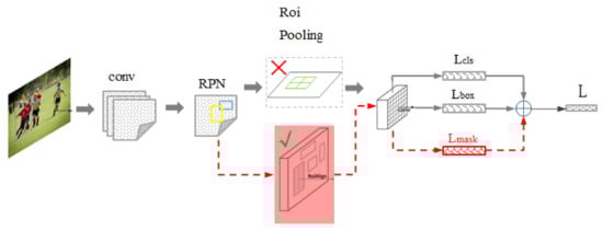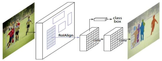 As shown in Figure 13, Mask R-CNN is a simple, flexible, versatile, and fast instance segmentation framework, which is based on the Faster R-CNN framework of convolutional neural networks. The mask branch is a small full convolutional network on Region of Interest ((RoI) which means “box on feature map”), parallel to the classification and border regression branches that generates high quality segmentation masks on a pixel-by-pixel predictive basis on each RoI, but the increase in computational effort is not significant [23]. Referring to Figure 2, the Faster R-CNN is a fully connected layer of the convolutional neural network based on Figure 2 followed by a classification branch and a regression branch, while the Mask R-CNN is a mask branch added to the Faster R-CNN in parallel with the classification branch and the regression branch.